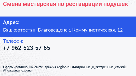 Смена, мастерская по реставрации подушек по адресу Башкортостан, Благовещенск, Коммунистическая, 12 в дальнейшем Организация, размещена в следующих категориях:
