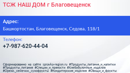 ТСЖ НАШ ДОМ, г. Благовещенск по адресу Башкортостан, Благовещенск, Седова, 118/1 в дальнейшем Организация, размещена в следующих категориях: