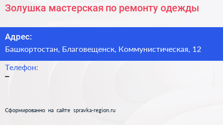 Золушка, мастерская по ремонту одежды по адресу Башкортостан, Благовещенск, Коммунистическая, 12 в дальнейшем Организация, размещена в следующих категориях: