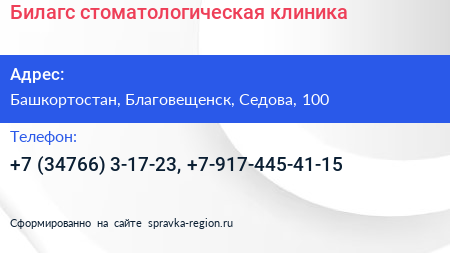 Билагс, стоматологическая клиника по адресу Башкортостан, Благовещенск, Седова, 100 в дальнейшем Организация, размещена в следующих категориях: