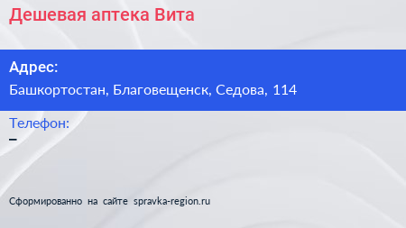 Дешевая аптека Вита по адресу Башкортостан, Благовещенск, Седова, 114 в дальнейшем Организация, размещена в следующих категориях: