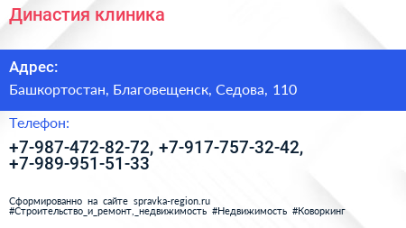Династия, клиника по адресу Башкортостан, Благовещенск, Седова, 110 в дальнейшем Организация, размещена в следующих категориях: