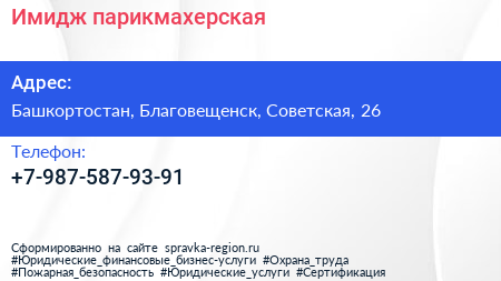 Имидж, парикмахерская по адресу Башкортостан, Благовещенск, Советская, 26 в дальнейшем Организация, размещена в следующих категориях: