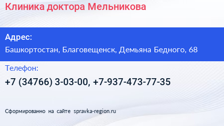 Клиника доктора Мельникова по адресу Башкортостан, Благовещенск, Демьяна Бедного, 68 в дальнейшем Организация, размещена в следующих категориях:
