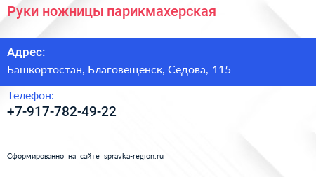 Руки-ножницы, парикмахерская по адресу Башкортостан, Благовещенск, Седова, 115 в дальнейшем Организация, размещена в следующих категориях: