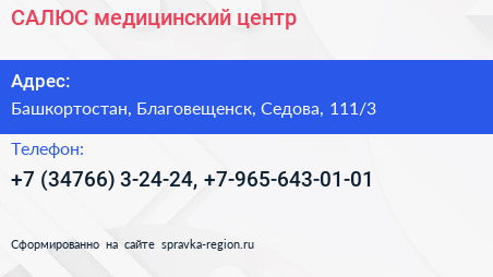 САЛЮС, медицинский центр по адресу Башкортостан, Благовещенск, Седова, 111/3 в дальнейшем Организация, размещена в следующих категориях: