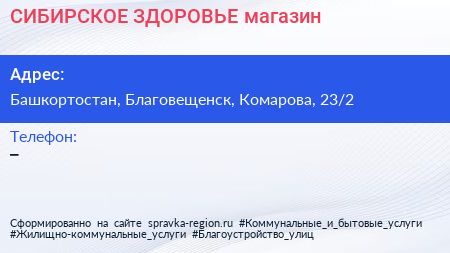 СИБИРСКОЕ ЗДОРОВЬЕ, магазин по адресу Башкортостан, Благовещенск, Комарова, 23/2 в дальнейшем Организация, размещена в следующих категориях: