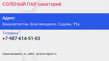 СОЛЕНЫЙ ПАР, санаторий по адресу Башкортостан, Благовещенск, Седова, 91а в дальнейшем Организация, размещена в следующих категориях:
