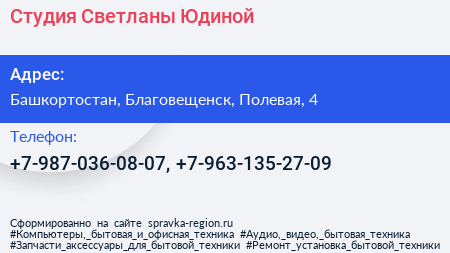 Студия Светланы Юдиной по адресу Башкортостан, Благовещенск, Полевая, 4 в дальнейшем Организация, размещена в следующих категориях: