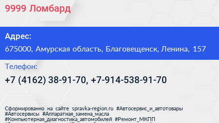 9999 Ломбард по адресу 675000, Амурская область, Благовещенск, Ленина, 157 в дальнейшем Организация, размещена в следующих категориях: