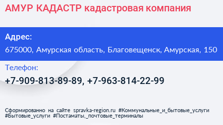 АМУР-КАДАСТР, кадастровая компания по адресу 675000, Амурская область, Благовещенск, Амурская, 150 в дальнейшем Организация, размещена в следующих категориях:
