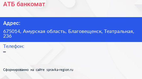 АТБ, банкомат по адресу 675014, Амурская область, Благовещенск, Театральная, 236 в дальнейшем Организация, размещена в следующих категориях: