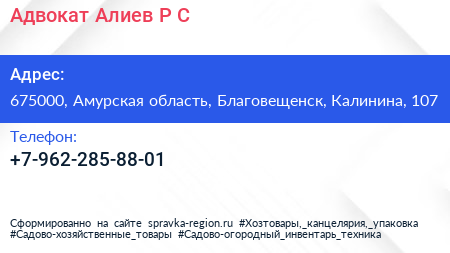 Адвокат Алиев Р.С. по адресу 675000, Амурская область, Благовещенск, Калинина, 107 в дальнейшем Организация, размещена в следующих категориях: