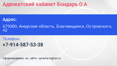 Адвокатский кабинет Бондарь О.А. по адресу 675000, Амурская область, Благовещенск, Островского, 42 в дальнейшем Организация, размещена в следующих категориях: