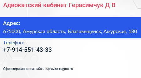 Адвокатский кабинет Герасимчук Д.В. по адресу 675000, Амурская область, Благовещенск, Амурская, 180 в дальнейшем Организация, размещена в следующих категориях: