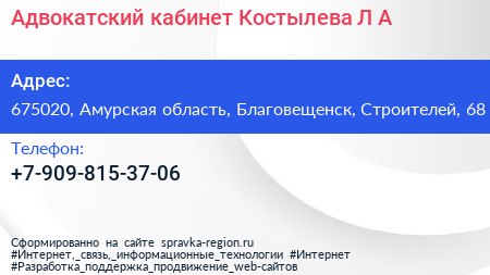 Адвокатский кабинет Костылева Л.А. по адресу 675020, Амурская область, Благовещенск, Строителей, 68 в дальнейшем Организация, размещена в следующих категориях:
