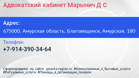 Адвокатский кабинет Марынич Д.С. по адресу 675000, Амурская область, Благовещенск, Амурская, 180 в дальнейшем Организация, размещена в следующих категориях: