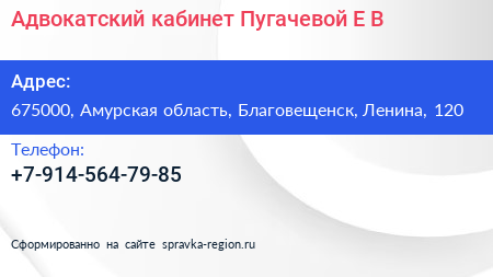Адвокатский кабинет Пугачевой Е.В. по адресу 675000, Амурская область, Благовещенск, Ленина, 120 в дальнейшем Организация, размещена в следующих категориях: