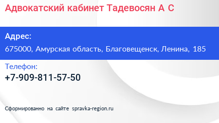 Адвокатский кабинет Тадевосян А.С. по адресу 675000, Амурская область, Благовещенск, Ленина, 185 в дальнейшем Организация, размещена в следующих категориях: