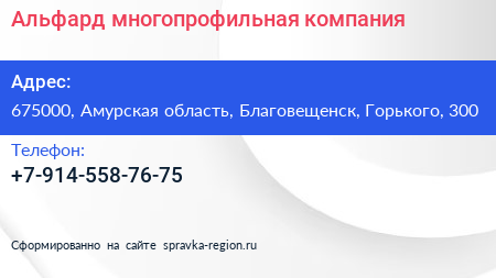 Альфард, многопрофильная компания по адресу 675000, Амурская область, Благовещенск, Горького, 300 в дальнейшем Организация, размещена в следующих категориях: