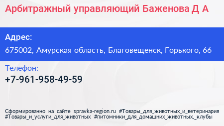 Арбитражный управляющий Баженова Д.А. по адресу 675002, Амурская область, Благовещенск, Горького, 66 в дальнейшем Организация, размещена в следующих категориях: