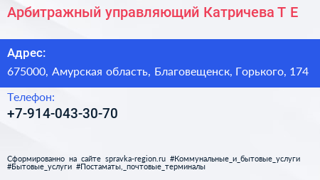 Арбитражный управляющий Катричева Т.Е. по адресу 675000, Амурская область, Благовещенск, Горького, 174 в дальнейшем Организация, размещена в следующих категориях: