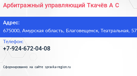 Арбитражный управляющий Ткачёв А.С. по адресу 675000, Амурская область, Благовещенск, Театральная, 57 в дальнейшем Организация, размещена в следующих категориях: