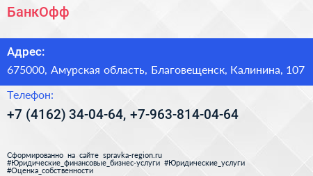 БанкОфф по адресу 675000, Амурская область, Благовещенск, Калинина, 107 в дальнейшем Организация, размещена в следующих категориях: