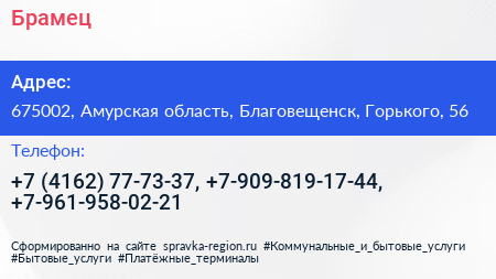Брамец по адресу 675002, Амурская область, Благовещенск, Горького, 56 в дальнейшем Организация, размещена в следующих категориях: