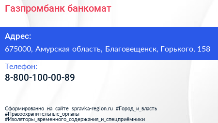 Газпромбанк, банкомат по адресу 675000, Амурская область, Благовещенск, Горького, 158 в дальнейшем Организация, размещена в следующих категориях: