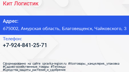 Кит Логистик по адресу 675002, Амурская область, Благовещенск, Чайковского, 3 в дальнейшем Организация, размещена в следующих категориях: