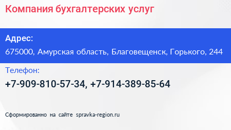 Компания бухгалтерских услуг по адресу 675000, Амурская область, Благовещенск, Горького, 244 в дальнейшем Организация, размещена в следующих категориях: