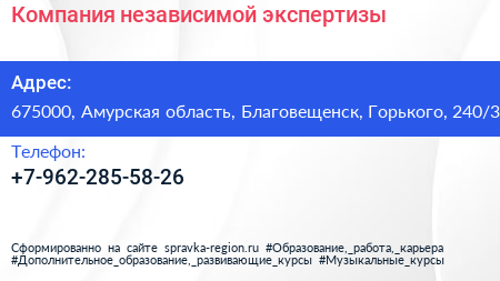 Компания независимой экспертизы по адресу 675000, Амурская область, Благовещенск, Горького, 240/3 в дальнейшем Организация, размещена в следующих категориях: