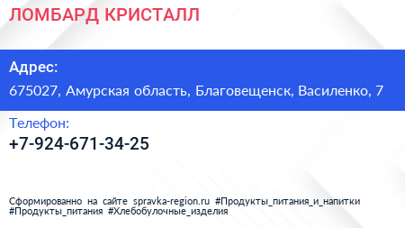 ЛОМБАРД-КРИСТАЛЛ по адресу 675027, Амурская область, Благовещенск, Василенко, 7 в дальнейшем Организация, размещена в следующих категориях: