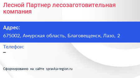Лесной Партнер, лесозаготовительная компания по адресу 675002, Амурская область, Благовещенск, Лазо, 2 в дальнейшем Организация, размещена в следующих категориях: