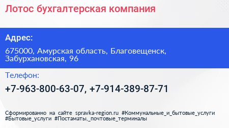 Лотос, бухгалтерская компания по адресу 675000, Амурская область, Благовещенск, Забурхановская, 96 в дальнейшем Организация, размещена в следующих категориях: