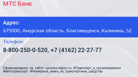 МТС Банк по адресу 675000, Амурская область, Благовещенск, Калинина, 52 в дальнейшем Организация, размещена в следующих категориях: