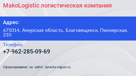 MakoLogistiс, логистическая компания по адресу 675014, Амурская область, Благовещенск, Пионерская, 210 в дальнейшем Организация, размещена в следующих категориях: