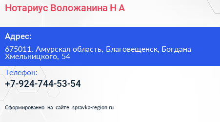 Нотариус Воложанина Н.А. по адресу 675011, Амурская область, Благовещенск, Богдана Хмельницкого, 54 в дальнейшем Организация, размещена в следующих категориях: