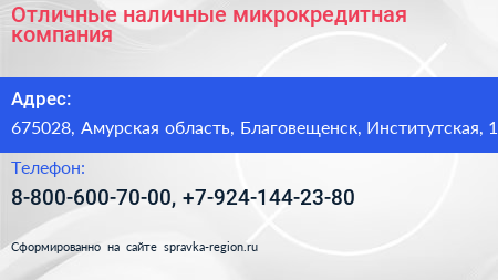 Отличные наличные, микрокредитная компания по адресу 675028, Амурская область, Благовещенск, Институтская, 1 в дальнейшем Организация, размещена в следующих категориях: