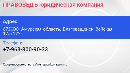ПРАВОВЕДЪ, юридическая компания по адресу 675000, Амурская область, Благовещенск, Зейская, 175/179 в дальнейшем Организация, размещена в следующих категориях: