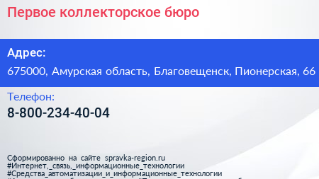 Первое коллекторское бюро по адресу 675000, Амурская область, Благовещенск, Пионерская, 66 в дальнейшем Организация, размещена в следующих категориях: