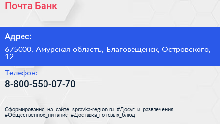 Почта Банк по адресу 675000, Амурская область, Благовещенск, Островского, 12 в дальнейшем Организация, размещена в следующих категориях: