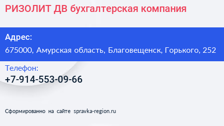 РИЗОЛИТ-ДВ, бухгалтерская компания по адресу 675000, Амурская область, Благовещенск, Горького, 252 в дальнейшем Организация, размещена в следующих категориях: