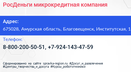 РосДеньги, микрокредитная компания по адресу 675028, Амурская область, Благовещенск, Институтская, 1 в дальнейшем Организация, размещена в следующих категориях: