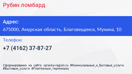 Рубин, ломбард по адресу 675000, Амурская область, Благовещенск, Мухина, 10 в дальнейшем Организация, размещена в следующих категориях: