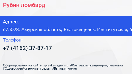 Рубин, ломбард по адресу 675028, Амурская область, Благовещенск, Институтская, 6 в дальнейшем Организация, размещена в следующих категориях: