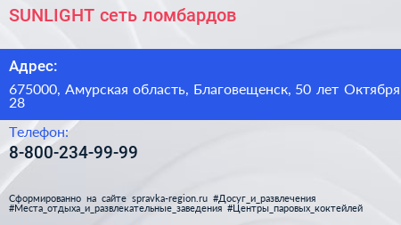 SUNLIGHT, сеть ломбардов по адресу 675000, Амурская область, Благовещенск, 50 лет Октября, 28 в дальнейшем Организация, размещена в следующих категориях:
