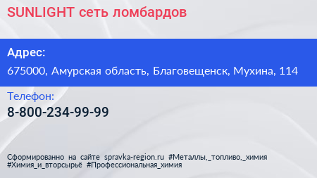 SUNLIGHT, сеть ломбардов по адресу 675000, Амурская область, Благовещенск, Мухина, 114 в дальнейшем Организация, размещена в следующих категориях: