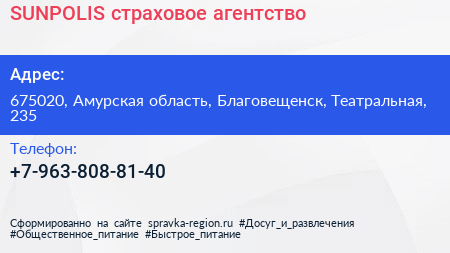 SUNPOLIS, страховое агентство по адресу 675020, Амурская область, Благовещенск, Театральная, 235 в дальнейшем Организация, размещена в следующих категориях: